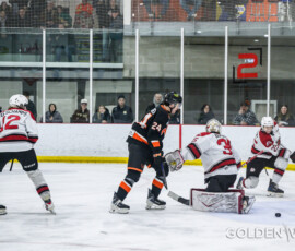 The second period featured more strong play by Virden as they made things difficult for the Flyers, eventually breaking through with the tying goal just 2:39 into the frame. Liam Ernst faced a number of good scoring chances and held the fort, seeing a total of 15 shots during the period. The teams skated into the intermission deadlocked at 1-1.